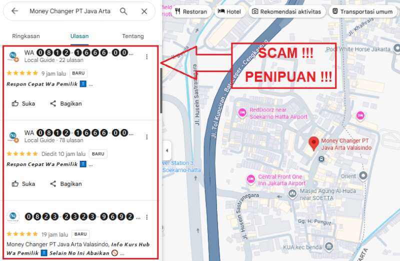 Kepada Pelanggan JAValas Money Changer harap berhati-hati terhadap Modus Penipuan Ulasan Google dengan Mencantumkan Nomor WhatsApp atau Telepon.